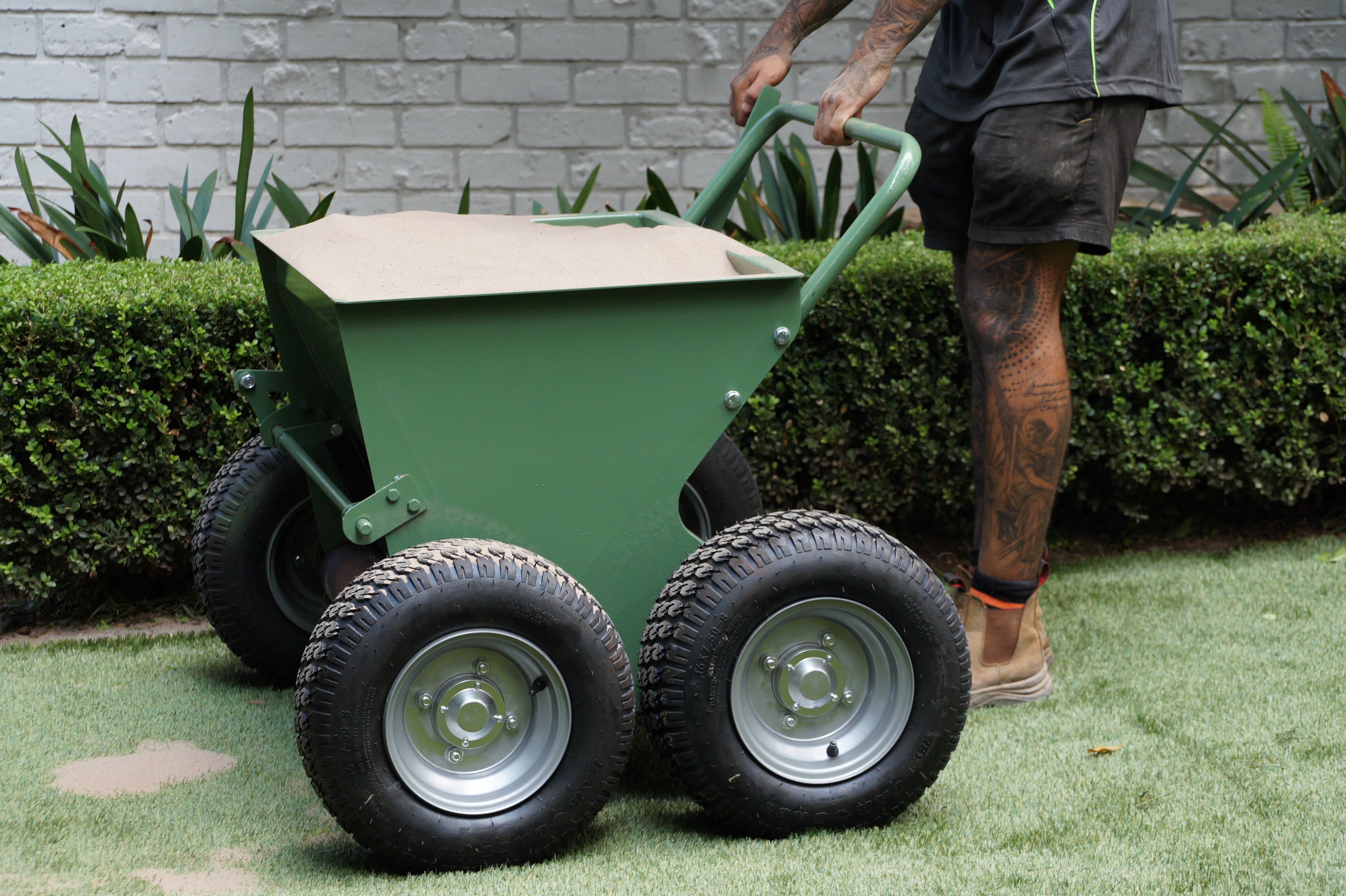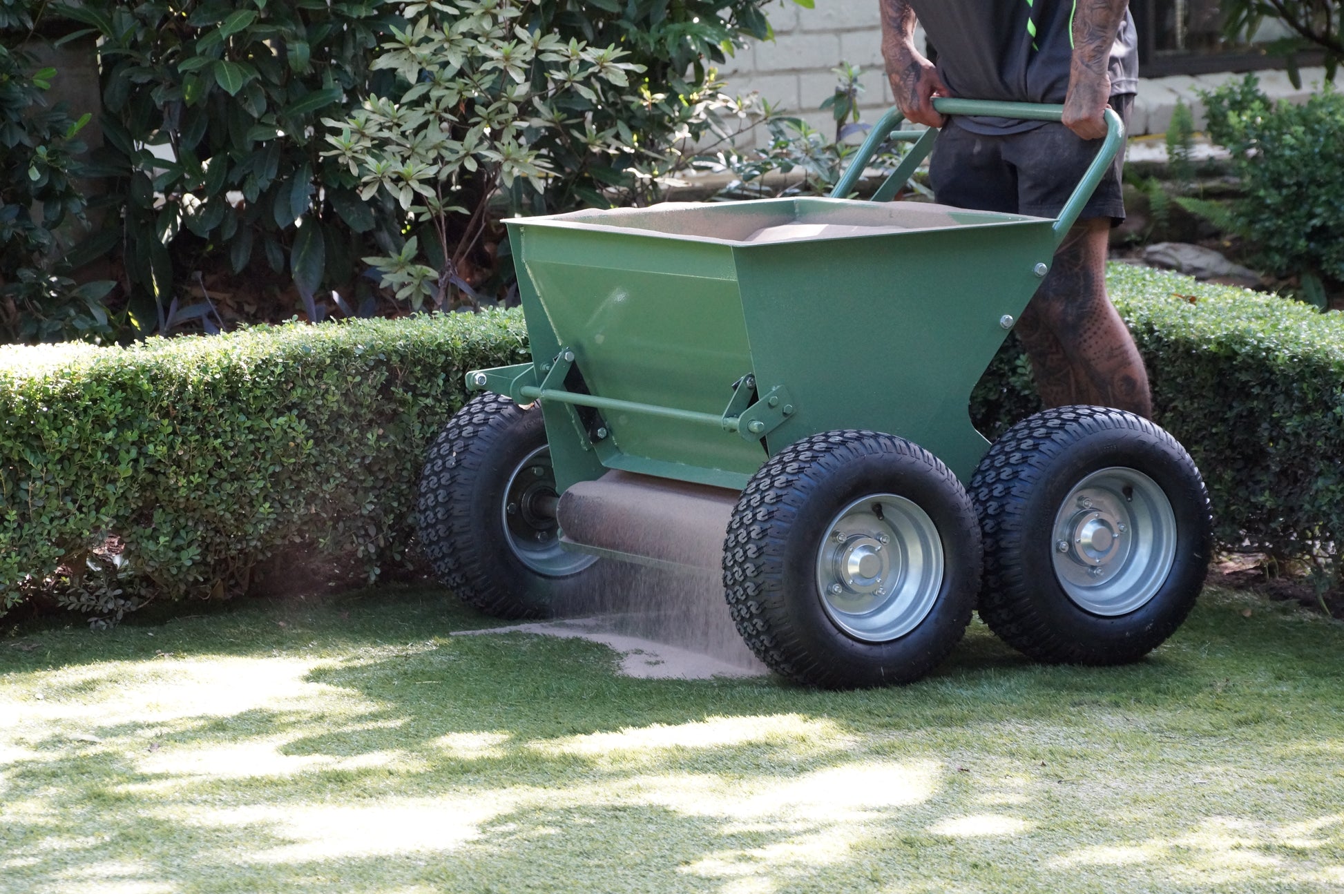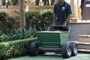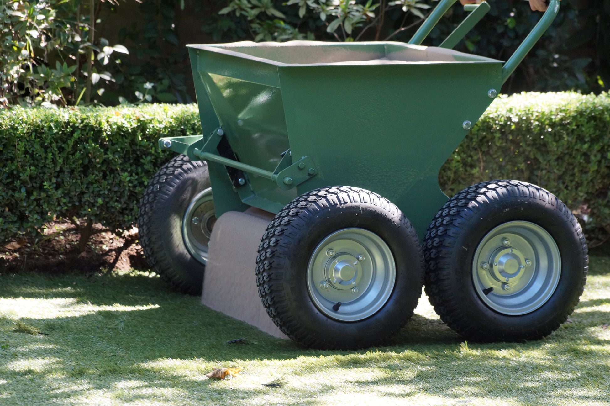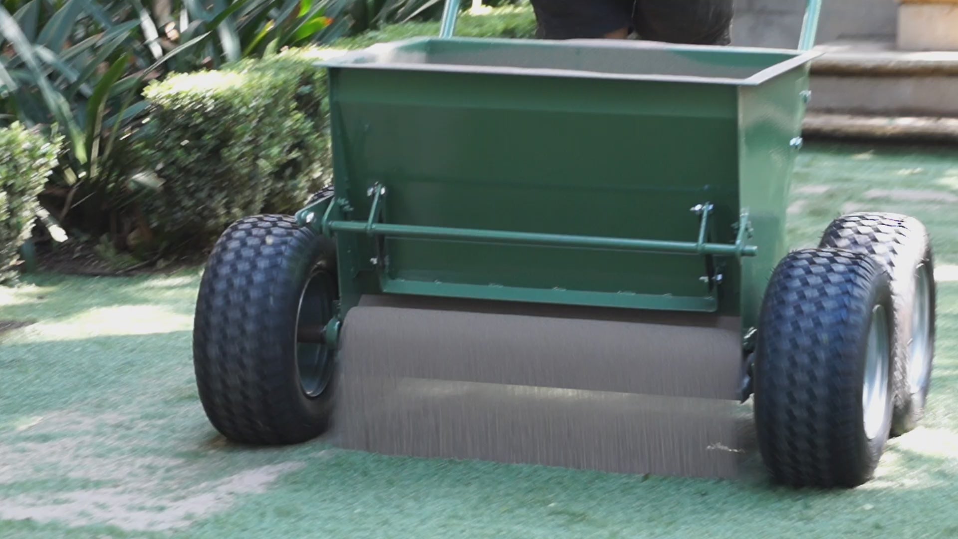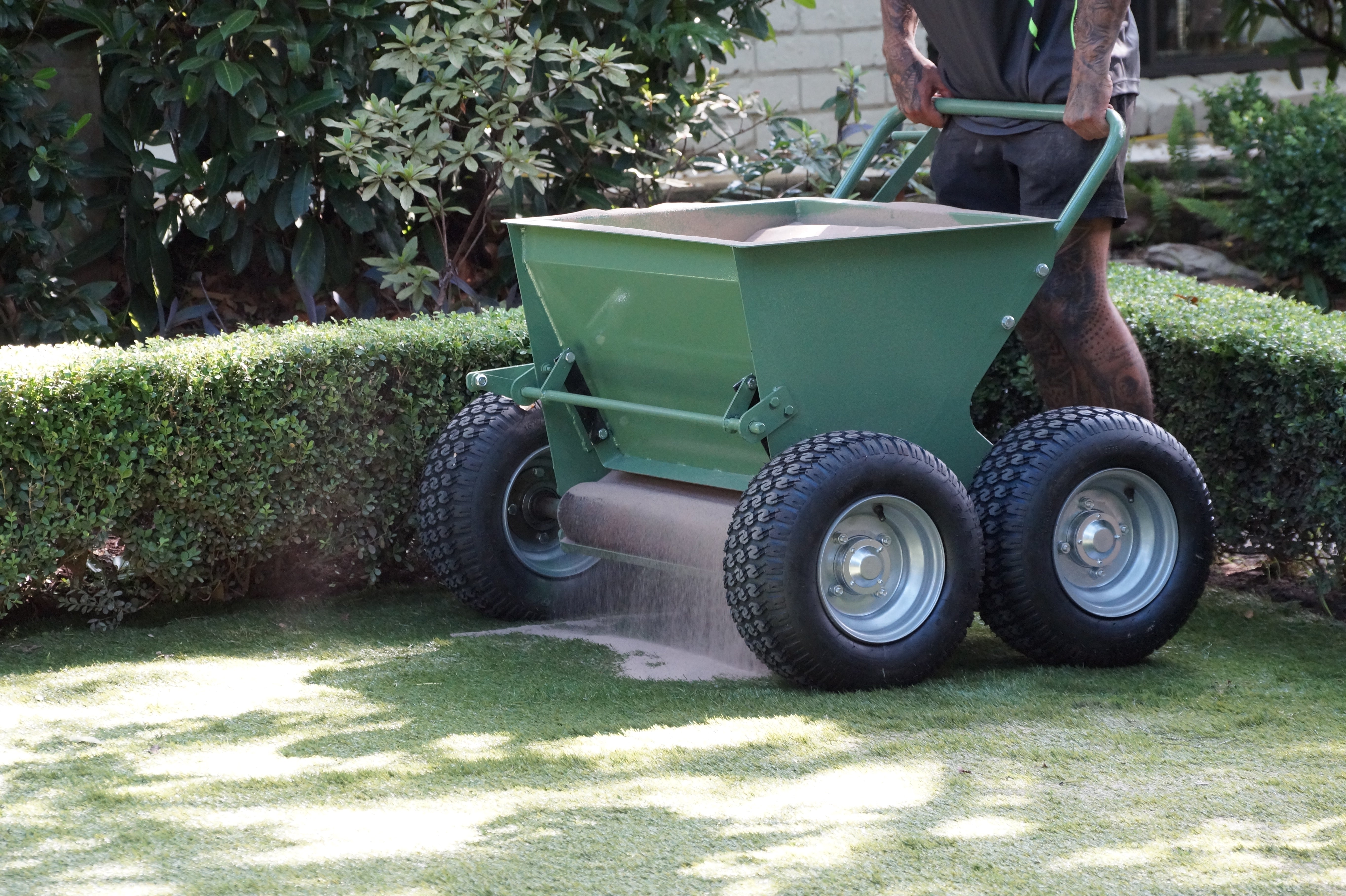 Machine designed to spread and brush sand or rubber infill evenly into synthetic turf.